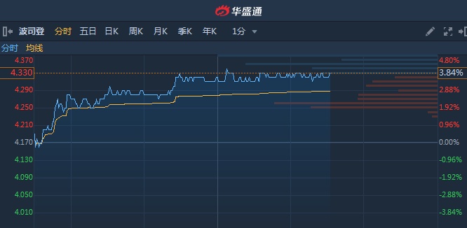 截至14时31分,涨3.84%,报价4.33港元,成交额1亿。值得注意的是,该股盘中高见4.34港元,再度刷新历史新高。