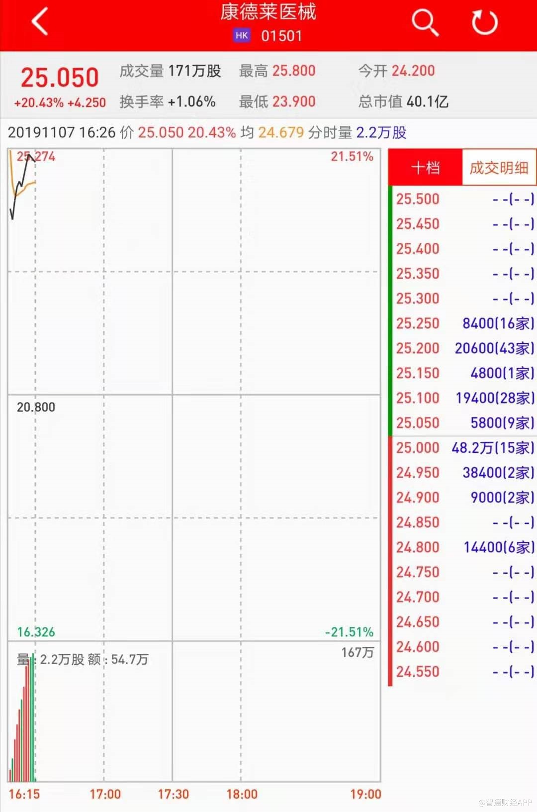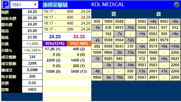 智通财经APP获悉,康德莱医械(01501)将于11月8日挂牌,暗盘持续走高,截止到发稿,辉立证券暗盘交易显示其报价24.20港元,较招股价20.80港元涨16.35%。每手200股,不计手续费,每手赚680港元。