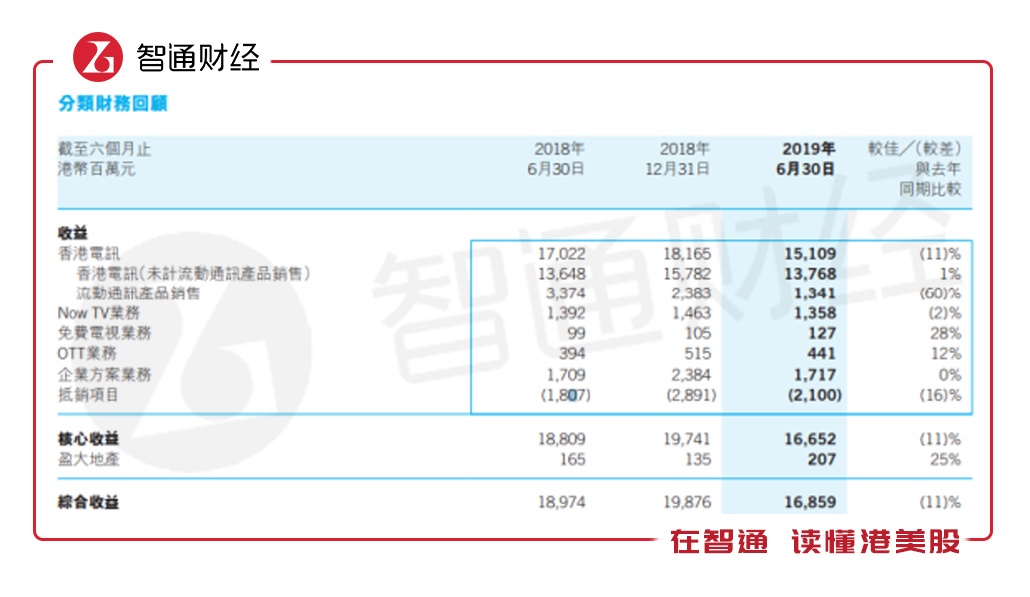 2019年公司中期业绩报告数据显示,公司上半年录得营收为168.59亿港元(单位下同),同比下滑11%,其中香港电讯151.09亿元收入占到了总比重的89.62%,营收下滑主要原因也是由于香港电讯业务中的流动通讯产品销售同比下滑60%导致的。