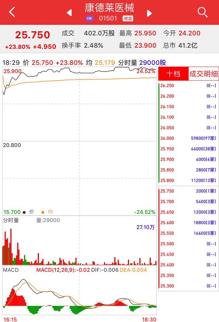 智通财经APP获悉,康德莱医械(01501)将于11月8日挂牌,今日暗盘开盘大涨,截至收盘,辉立证券暗盘交易显示其报价25.75港元,较招股价20.80港元涨23.798%。每手200股,不计手续费,每手赚990港元。