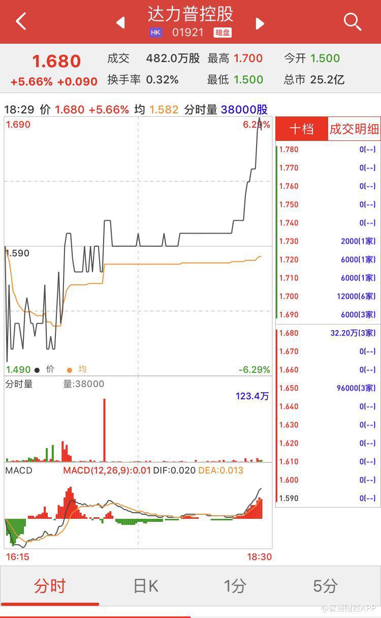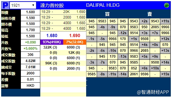 智通财经APP获悉,达力普控股(01921)将于11月8日挂牌,上市前夕,辉立证券暗盘交易显示其收报1.68港元,较招股价1.59港元涨5.66%。每手2000股,不计手续费,每手赚180港元。
