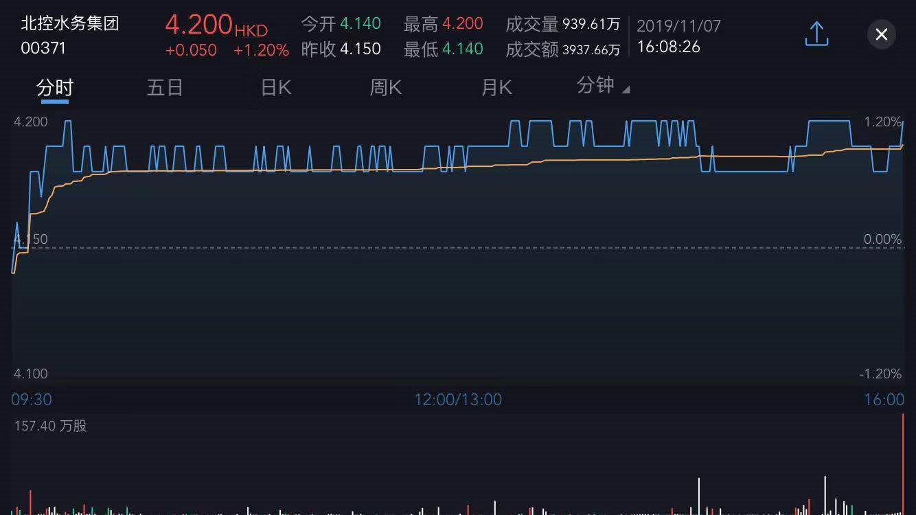 截至今日收盘,北控水务(00371)涨1.20%,报4.2港元。