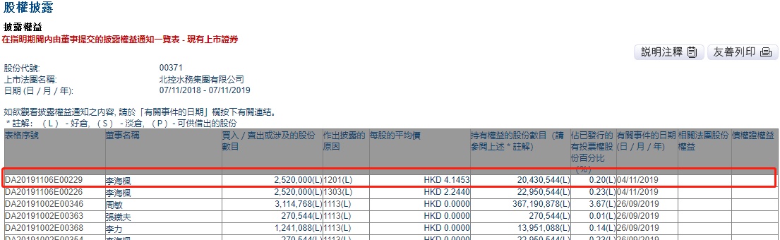 智通财经APP获悉,联交所最新资料显示,11月4日,执董李海枫减持北控水务(00371)252万股,每股作价4.1453港元,涉及总金额约为1044.62万港元。减持后最新持股数目约为2043万股,最新持股比例为0.20%。