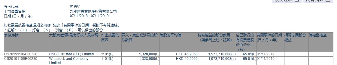 智通财经APP获悉,联交所最新资料显示,11月1日,会德丰增持九龙仓置业(01997)132.8万股,每股作价46.20港元,总金额约为6135万港元,增持后持股数为约19.73亿股,最新持股比例为65.01%。