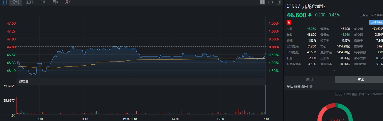 截止至今日收盘,九龙仓置业跌0.43%,每股报价46.60港元