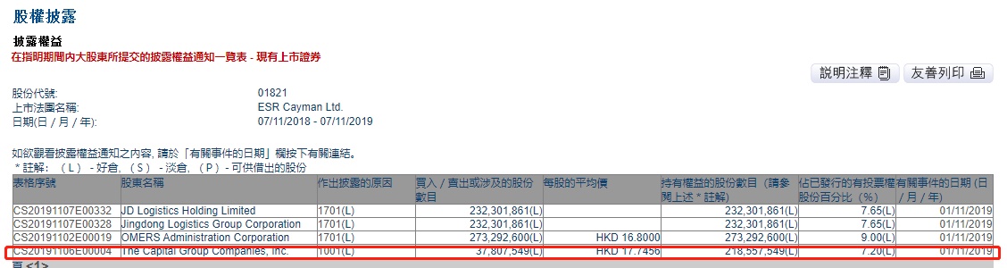 智通财经APP获悉,联交所最新资料显示,11月1日,The Capital Group Companies, Inc.增持ESR(01821)3780.75万股,每股作价17.7456港元,涉及总金额约为6.71亿港元。增持后最新持股数目约为2.19亿股,最新持股比例为7.20%。
