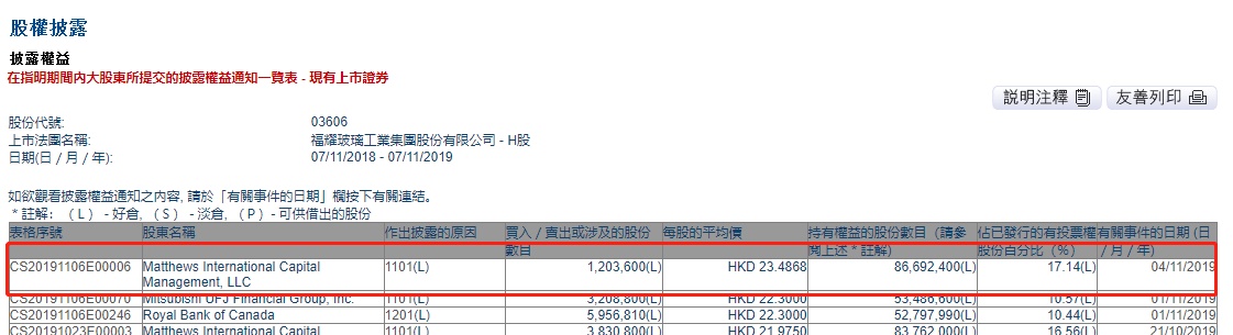 智通财经APP获悉,联交所最新资料显示,11月4日,Matthews International Capital Management, LLC增持福耀玻璃(03606)120.36万股,每股作价23.4868港元,涉及总金额约为2826.87万港元。增持后最新持股数目约为8670万股,最新持股比例为17.14%。
