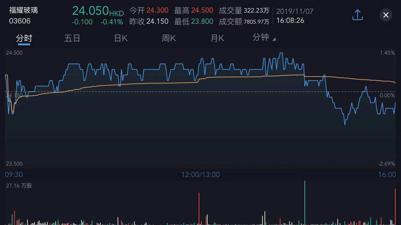 截至今日收盘,福耀玻璃(03606)跌0.41%,报24.05港元。