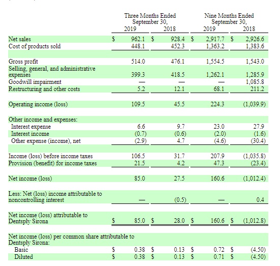 智通财经APP获悉,美东时间11月7日美股盘前,登士柏西诺德( XRAY.US)公布了2019年第三季度财报,登士柏本季度销售收入为9.6亿美元,同比增长3%。