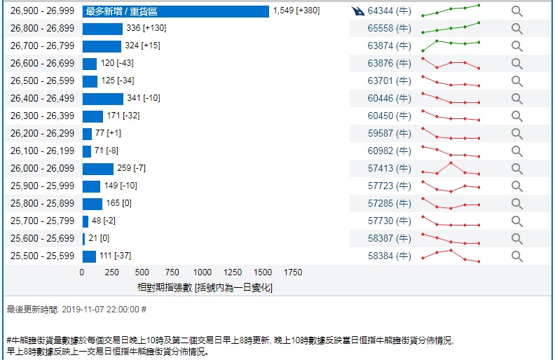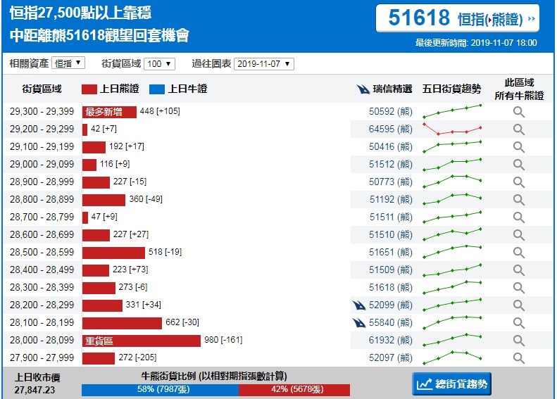 智通财经APP获悉,截至11月7日,恒指最新的牛熊街货比例58:42。瑞信恒指牛熊证街货分布图中的数据显示,熊证街货重货区在28000-28099区间,该区间最新熊证数量为980张,较上一交易日减少161张,最多新增在29300-29399区间,较上一交易日增加105张。牛证街货重货区和最多新增区都在26900-26999区间,该区间最新牛证数量为1549张,比上一交易日增加380张。