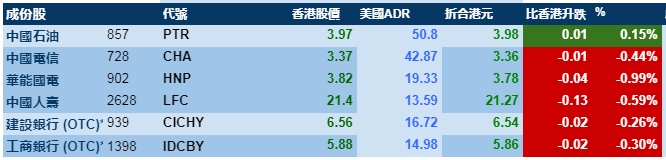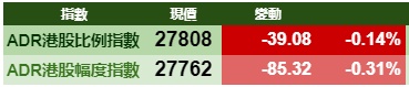 智通财经APP获悉,美股道指再创新高,但港股ADR指数全日微跌,按比例计算,收报27808点,跌39.08点或0.14%。大型蓝筹下跌为主,汇丰控股收报60.17元,较港收市跌0.03元;腾讯控股收报334.36元,较港收市升0.76元。