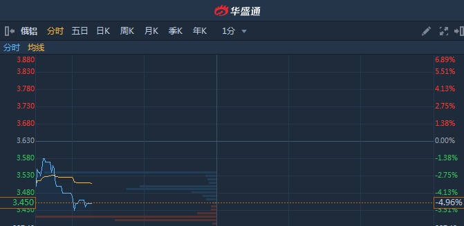 截至10时15分,跌4.96%,报价3.45港元,成交额4320万。