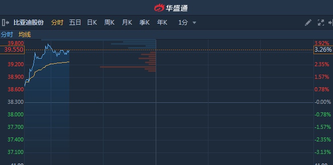 智通财经APP获悉,比亚迪(01211)拟与丰田汽车公司合资成立纯电动车研发公司,消息刺激股价上涨。截至10时20分,涨3.26%,报价39.55港元,成交额1.304亿。