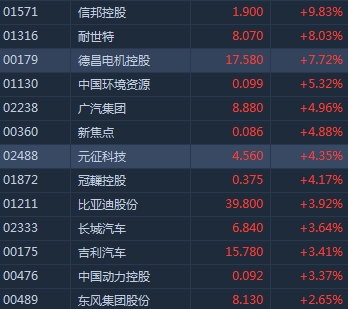 截至13时58分,耐世特(01316)涨8.03%,报价8.07港元,广汽集团(02238)涨4.96%,比亚迪(01211)涨3.92%,长城汽车(02333)涨3.64%,吉利汽车(00175)涨3.41%。