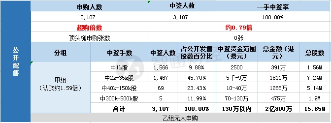 其中,公开配售申购人数3107,一手中签率100%,超购倍数约0.79倍。