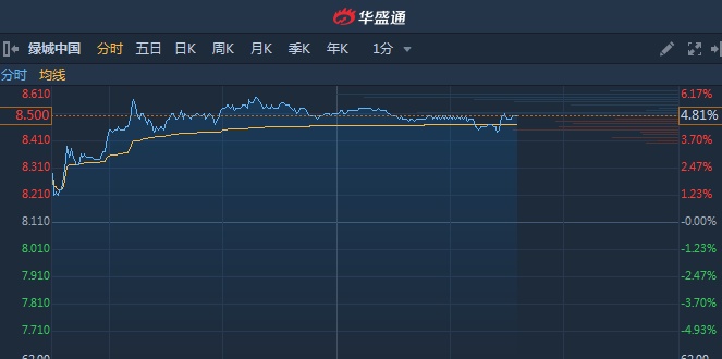 智通财经APP获悉,绿城中国(03900)前10个月总销售额同比增30.24%至1503亿元,销售数据超市场预期,刺激股价盘中创逾一年新高。截至14时35分,涨4.81%,报价8.5港元,成交额9686万。