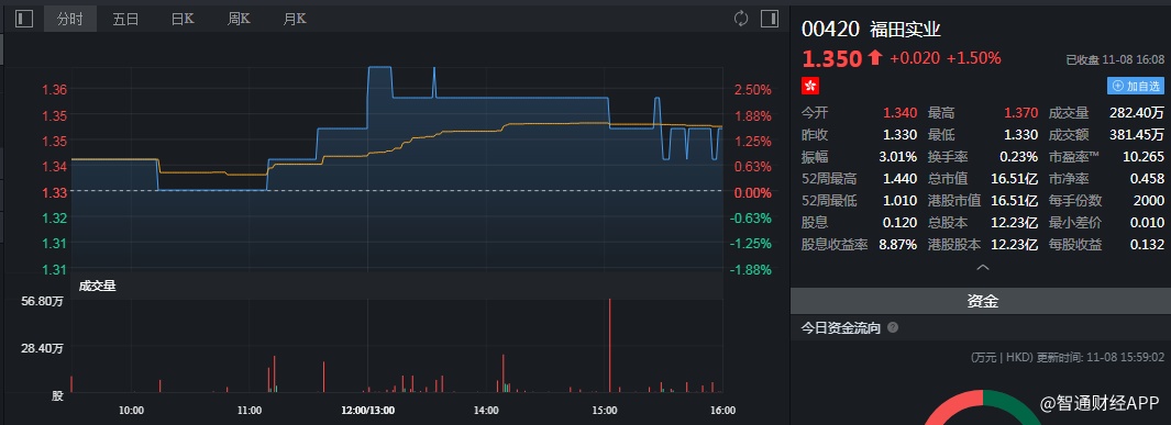 截至今日收盘,福田实业(00420)涨1.50%,报1.35港元。