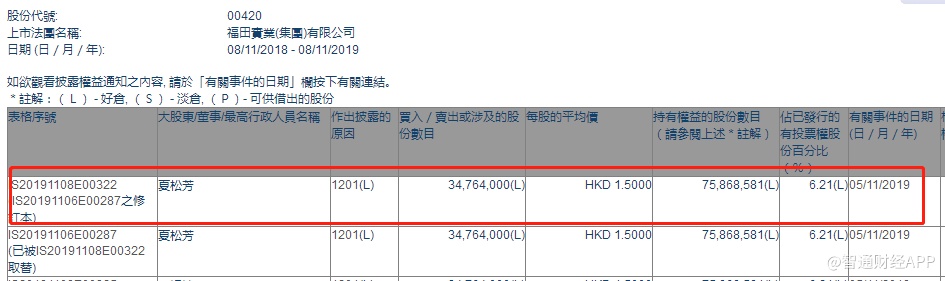 智通财经APP获悉,联交所最新资料显示,11月5日,股东夏松芳减持福田实业(00420)3476.4万股,每股作价为1.50港元,总金额为5214.6万港元。减持后最新持股数目约为7586.86万股,最新持股比例为6.21%。