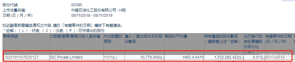 智通财经APP获悉,联交所最新资料显示,11月5日,GIC Private Limited增持中石化(00386)1077万股,每股作价为4.6415港元,总金额约为4998.90万港元。增持后最新持股数目约为15.32亿股,最新持股比例为6.01%。