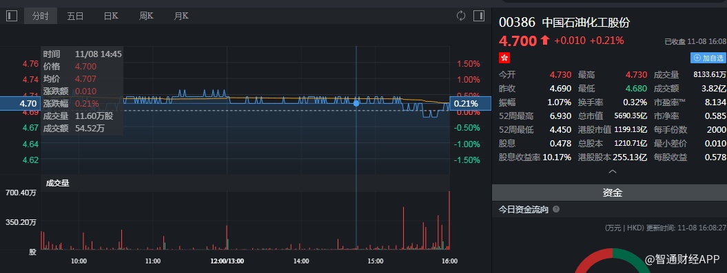 截至今日收盘,中石化(00386)涨0.21%,报4.70港元。
