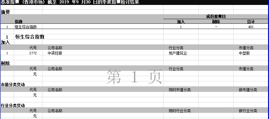 智通财经APP获悉,11月8日,恒生指数有限公司公布了截止至9月30日的恒生指数系列季度检讨结果,所有变动将于2019年12月9 日 (星期一) 起生效。