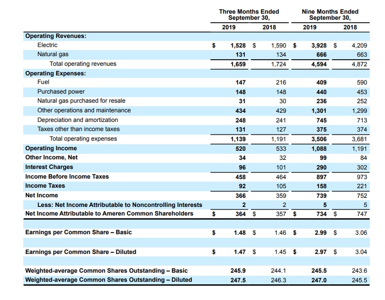 财报显示AEE2019年第三季度的营收为16.5亿美元,去年同期为17.2亿美元,同比降低4%。其中来自电气部门的收入为15.2亿美元,略低于去年同期的15.9亿美元。来自天然气的收入为1.31亿美元,基本与去年同期持平。本季度的运营支出为11.4亿美元,略低于去年同期的11.9亿美元。