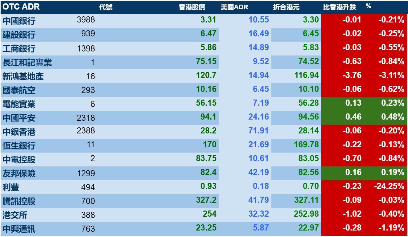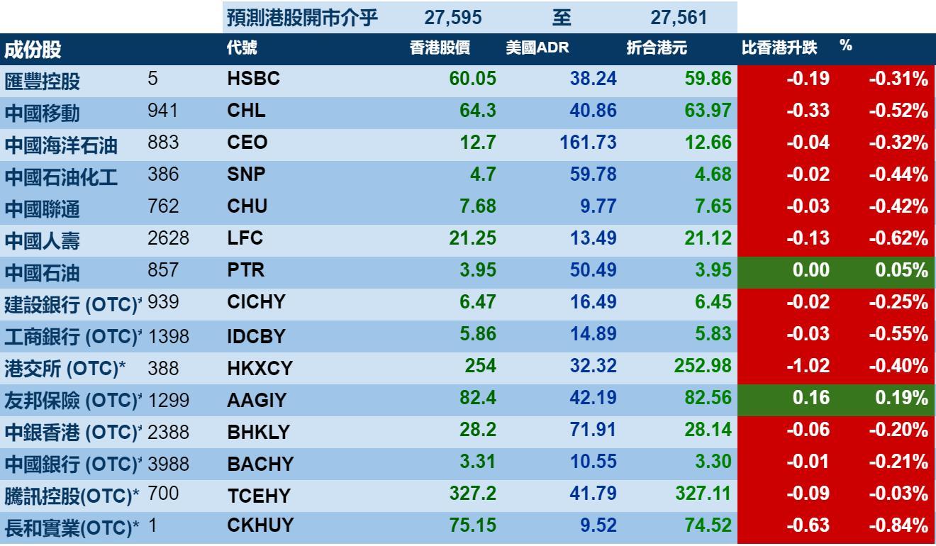 智通财经APP获悉,周五美股小幅收涨,但港股ADR指数却遭遇调整微跌,按比例计算,收报27595点,跌56.19点或0.20%。大型蓝筹下跌为主,汇丰控股收报59.86元,较港收市跌0.19元;腾讯控股收报327.11元,较港收市跌0.09元。