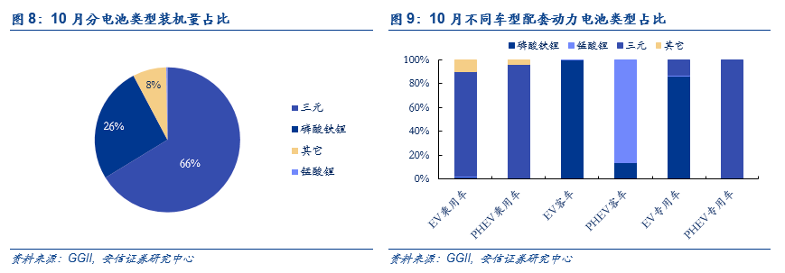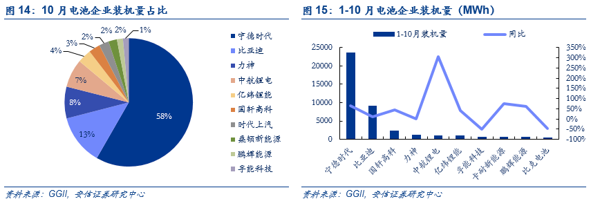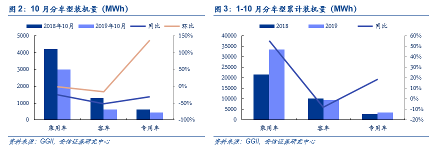 新能源专用车表现亮眼,10月装机电量为0.45GWh,占总体的10.9%,同比下降31%,环比大增137%;1-10月新能源专用车装机量累计为3.39GWh,同比增长18.5%。