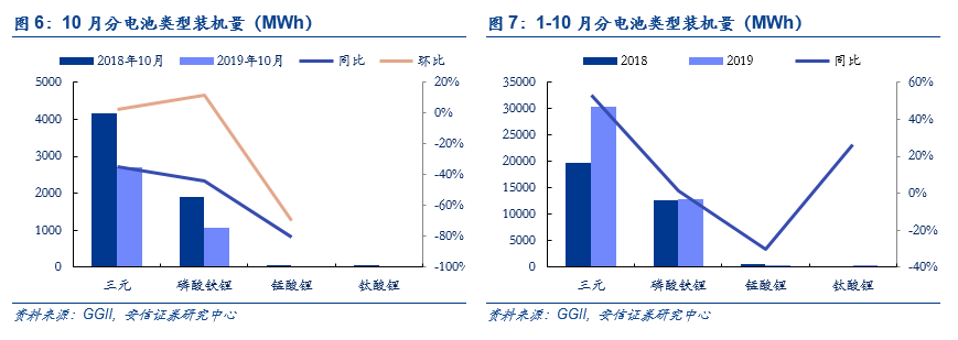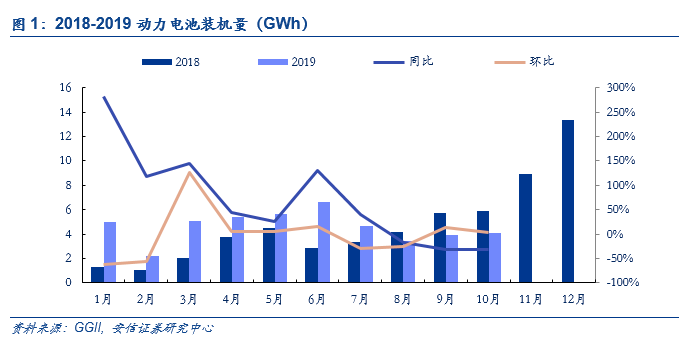 根据GGII数据,2019年10月我国新能源汽车产量约为8.29万台,同比下降39%,环比增长9%;动力电池装机总电量为4.07GWh,同比下降31%,环比增长3%。