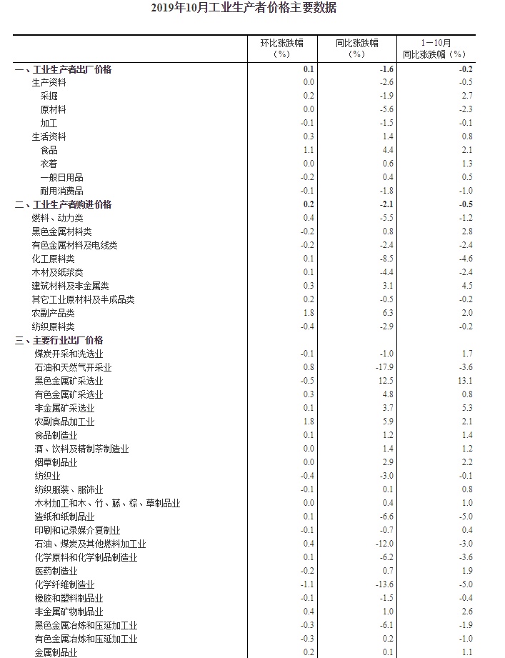 智通财经APP获悉,2019年10月份,全国工业生产者出厂价格同比下降1.6%,环比上涨0.1%;工业生产者购进价格同比下降2.1%,环比上涨0.2%。1—10月平均,工业生产者出厂价格比去年同期下降0.2%,工业生产者购进价格下降0.5%。