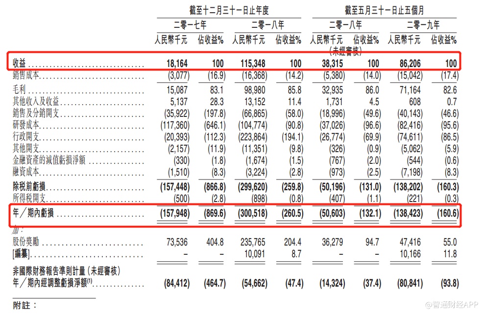 2017年至2018年以及截至2019年5月31日止5个月,公司录得收益分别为1816.4万元(人民币,下同)、1.15亿元以及8620.6万元;期内亏损分别为1.58亿元、3.01亿元以及1.38亿元;期内毛利率分别为83.1%、85.8%以及82.6%。