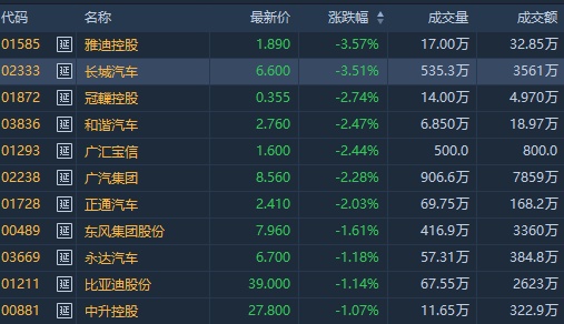 截至发稿长城汽车跌4.53%,报6.53港元;华晨中国(01114)跌3.65%,报8.98港元;广汽集团(02238)跌2.74%,报8.52港元;北京汽车(01958)跌2.36%,报4.96港元;东风集团(00489)跌2.1%,报7.92港元。