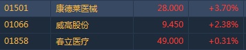 智通财经APP获悉,医疗器械板块集体逆市上涨,次新股康德莱医械(01501)领涨板块,截至11时33分,康德莱医械涨3.7%,报价28港元,威高股份(01066)涨2.38%,报9.45港元,盘中高见9.47港元,创逾五年半新高。春立医疗(01858)涨0.31%,报49港元。