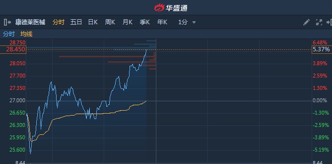 智通财经APP获悉,康德莱医械(01501)上市次日,涨势延续,暂领涨医疗器械板块,截至11时48分,涨5.19%,报价28.4港元,成交额4036万。