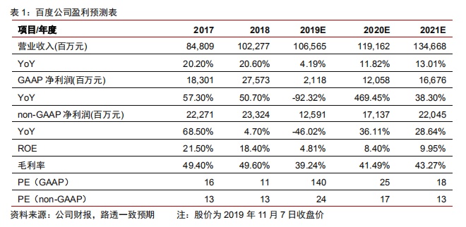 该行指出,当前市场一致预测百度2019/20/21年收入1066/1192/1347亿元,非公认会计准则净利润126/171/220亿元。公司当前估值对应2019/20/21年非公认会计准则市盈率分别为24/17/13倍,估值已充分反映搜索业务增速的放缓,同时AI、云计算等业务价值则基本未计入,长期估值修复空间较为明显。