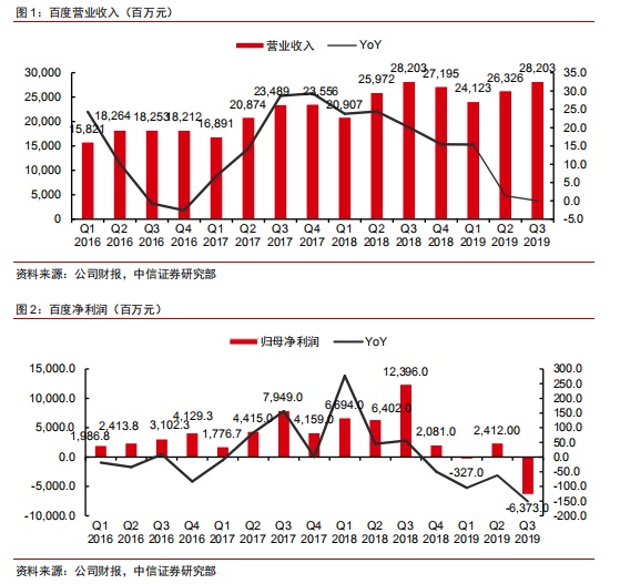 百度于近日公布了2019年三季报数据,当季营收同比基本持平,营收与利润数据均超出市场预期。智通财经APP获悉,中信证券今日发布研报称,源于搜索业务的恢复增长以及整体成本、费用的有效控制,百度(BIDU.US)三季度主要业绩指标超越市场预期。同时该公司核心百度APP、小程序用户继续维持快速增长,AI、云计算等业务实现高速增长,在线视频业务亦有望伴随政策逐步放松而进入改善通道。