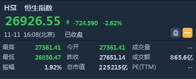 智通财经APP获悉,恒指早盘低开289.73点或1.05%,报27361.41点。午后失守两万七千点大关,一度跌超800点,盘中低见26830.47点。截至收盘,恒生指数跌724.59点或2.62%,报26926.55点,全日成交额达865.61亿。国企指数跌2.47%,报10613.63点,红筹指数跌2.34%,报4297.24点。