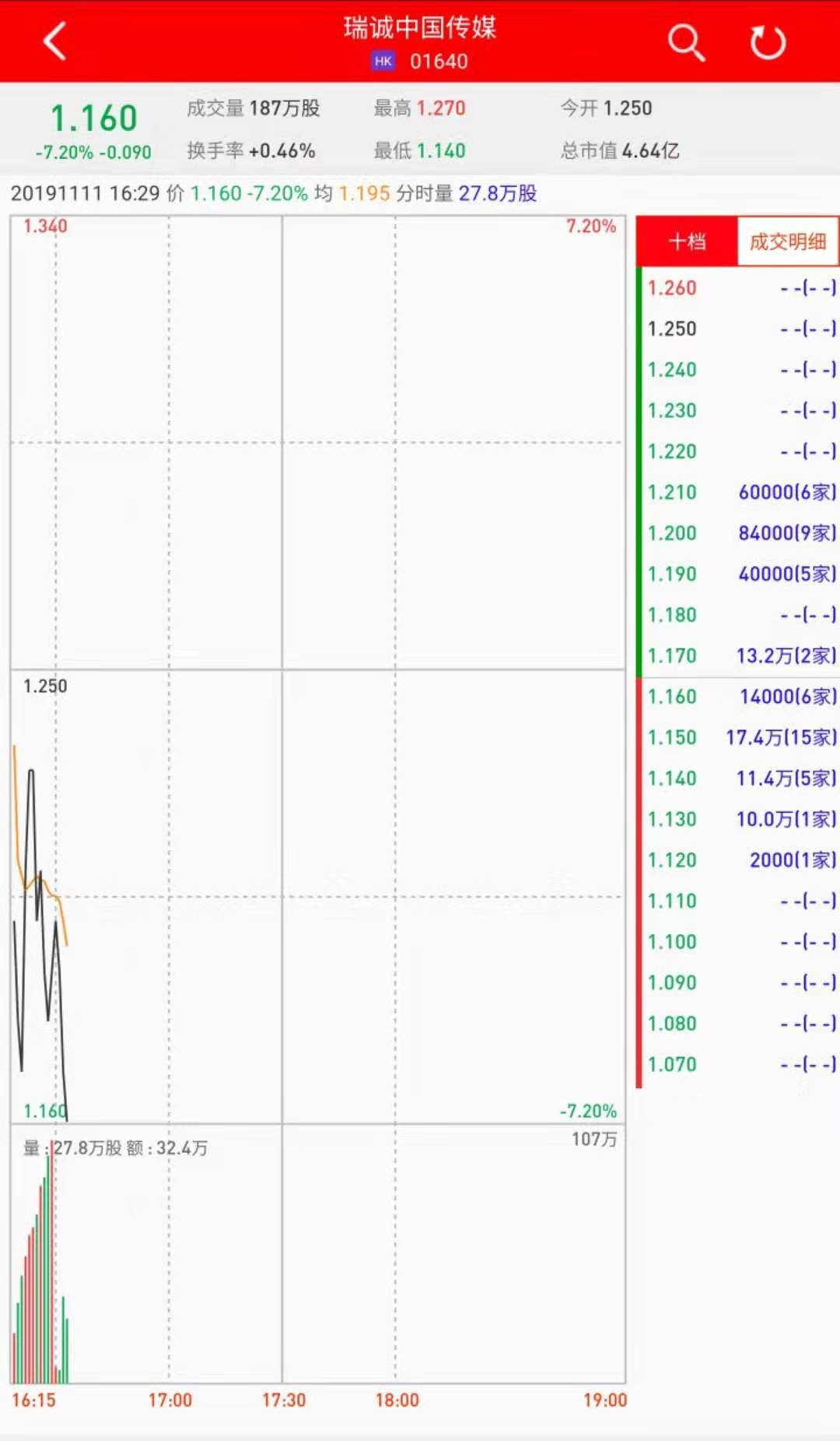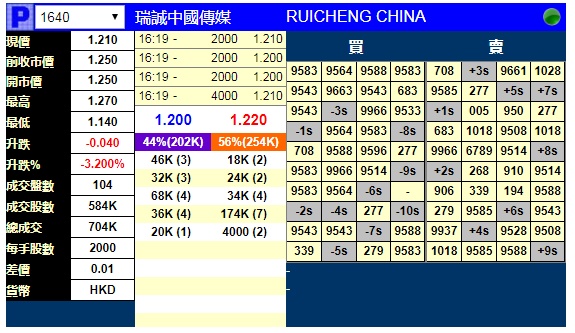 智通财经APP获悉,瑞诚中国传媒(01640)将于11月12日挂牌,截止到发稿,辉立证券暗盘交易显示其报价1.21港元,较招股价1.25港元跌3.20%。每手2000股,不计手续费,每手亏80港元。