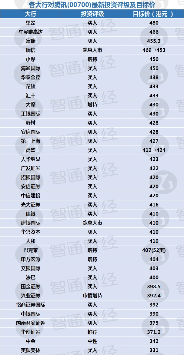 以下是各大行对腾讯最新投资评级及目标价: