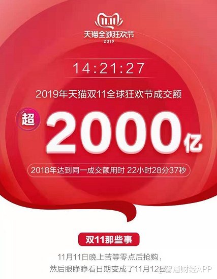 下午2点21分27秒,天猫双11成交额突破2000亿,用时较2018年同期缩短8个小时;