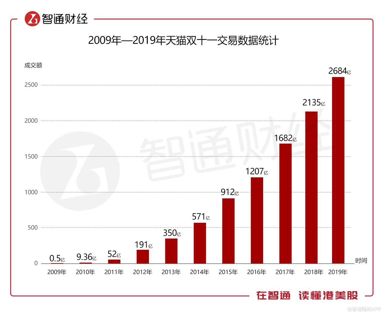 回顾2009-2019年,天猫双十一成交额每年都在创造新高。过去11年,天猫双十一成交额从最初的0.5亿元巨幅增长至2684亿元,其背后是阿里准确把握了当前电商发展趋势。