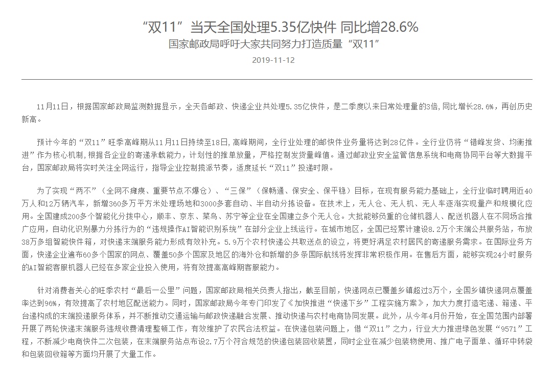智通财经APP获悉,11月11日,根据国家邮政局监测数据显示,全天各邮政、快递企业共处理5.35亿快件,是二季度以来日常处理量的3倍,同比增长28.6%,再创历史新高。
