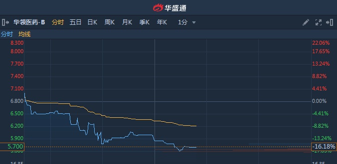 智通财经APP获悉,华领医药-B(02552)盘中跌幅持续扩大,曾一度低见5.6港元,创历史新低,暂居跌幅榜首位。截至13时45分,跌16.18%,报价5.7港元,成交额720.2万。