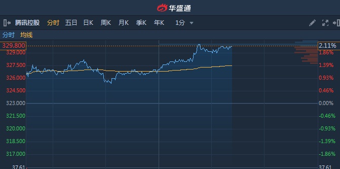 智通财经APP获悉,腾讯(00700)将于明日发布三季度业绩,获多家大行唱好,午后涨幅扩大至2%,指数贡献第一。截至14时22分,涨2.11%,报价329.8港元,成交额31.65亿。