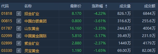 截至发稿,中国白银集团(00815)跌3.61%,报0.8港元;山东黄金(01787)跌3.59%,报16.12港元;中国黄金国际(02099)跌3.33%,报5.8港元;紫金矿业(02899)跌2.71%,报2.87港元。