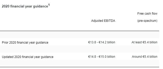 此外,公司还更新了2020财年的指引,提升调整后的EBITDA预期至148-150亿欧元(之前为138-142亿欧元),将自由现金流预期从大约54亿欧元调整为至少54亿欧元。