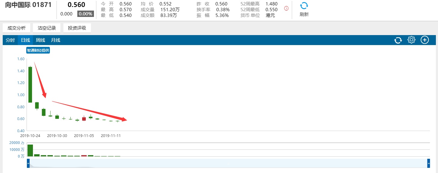 10月24日上市的向中国际,高开逾14%。但是股价在高位停留不足一分钟就开始下杀,15分钟,股价涨跌幅从+14%变成-18%,追高的短线客瞬间亏损超过30%。开盘首日收跌32%,刚在资本市场逗留一天,向中国际就加入了细价股行列。