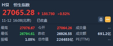 智通财经APP获悉,恒指早盘高开137.71点或0.51%,报27064.26点。截至收盘,恒生指数涨138.73点或0.52%,报27065.28点,全日成交额达691.22亿。国企指数涨0.73%,报10691.09点,红筹指数涨1%,报4340.41点。