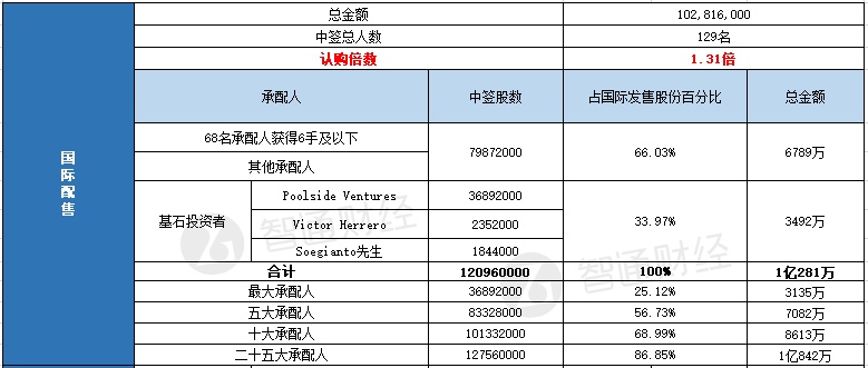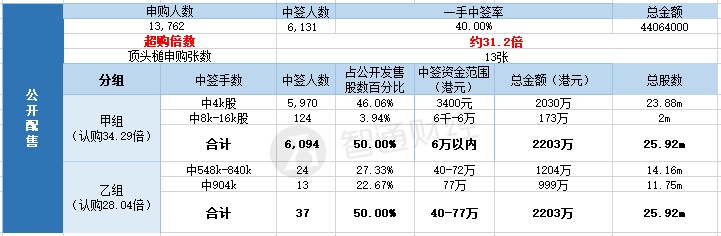 其中,公开配售申购人数13762,一手中签率40%,超购倍数约31.2倍。