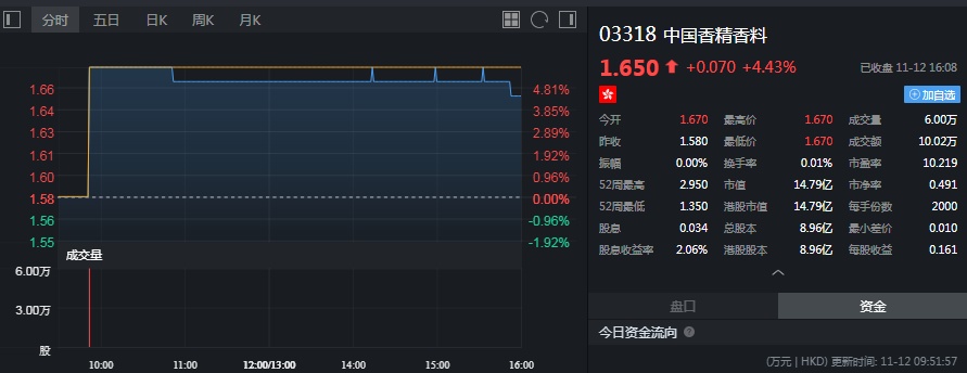 截至今日收盘,中国香精香料(03318)涨4.43%,报1.65港元。